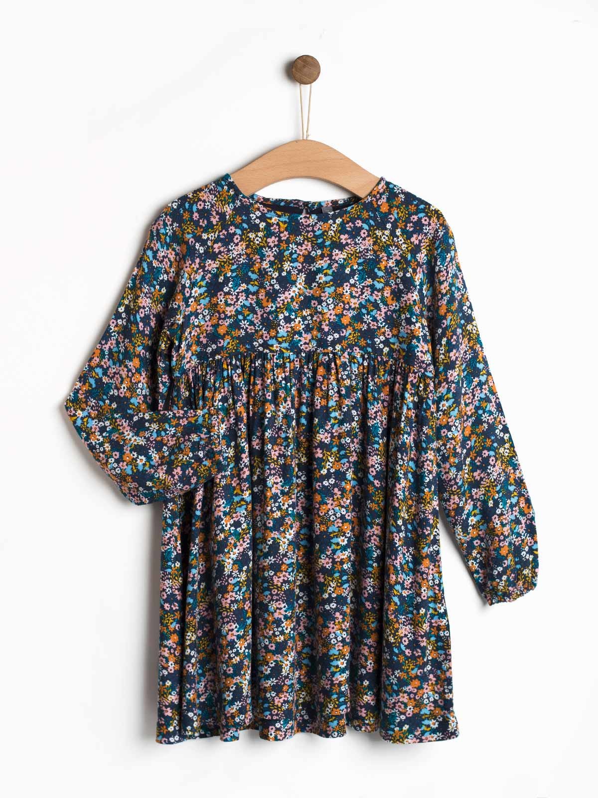 Vestido de flores para menina. Vestido de manga comprida e decote redondo. Fecho de lágrima na parte de trás com botão. Punhos elásticos