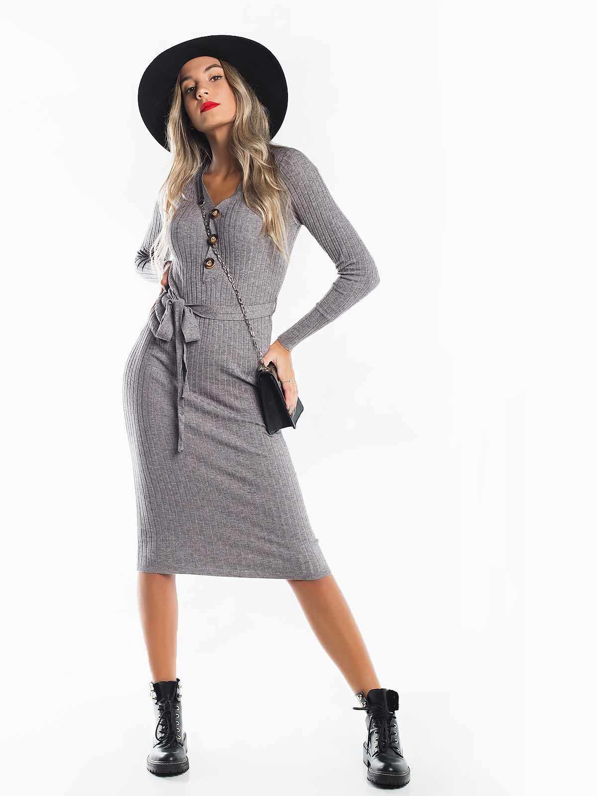 Vestido midi justo em malha canelada manga comprida. Vestido decote em bico com botões. Cinto em malha para laço. A modelo veste tamanho S/ M