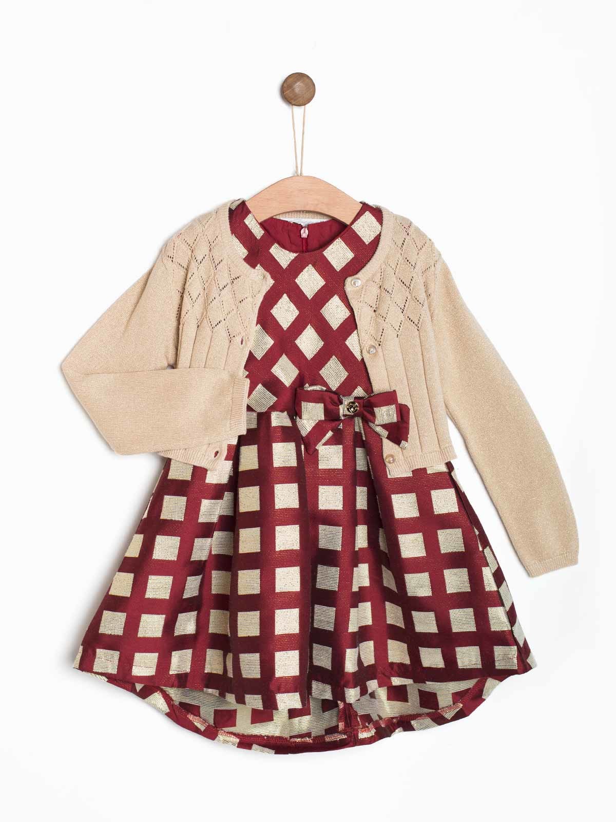 Vestido menina sem mangas aos quadrados com laço aplicado. Bolero em malha com botões.